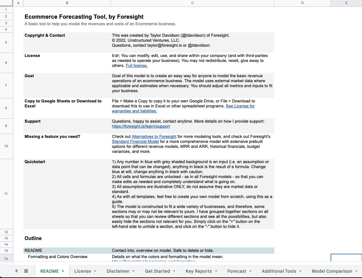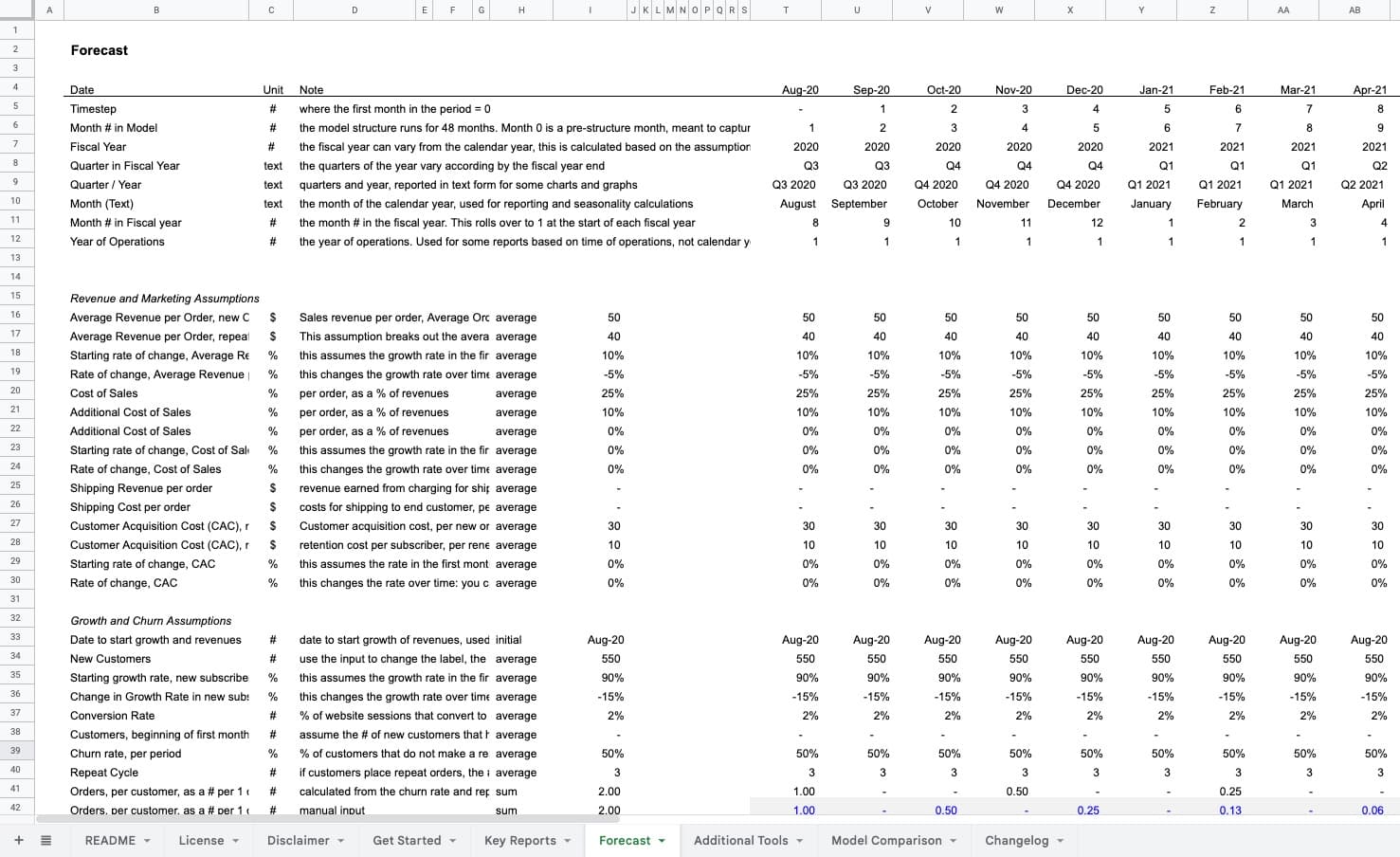 The free Ecommerce Model is the simplest structure of the models for forecasting Ecommerce businesses. Creates a forecast of acquisitions, retentions, revenues, acquisition costs, cost of goods sold, CAC and LTV, and is easy to use for ecommerce or transaction-style businesses. I built this tool to help entrepreneurs understand the mechanics behind forecasting the growth and revenues of an ecommerce business, in a package that is easy to use, easy to edit, and easy to understand.
