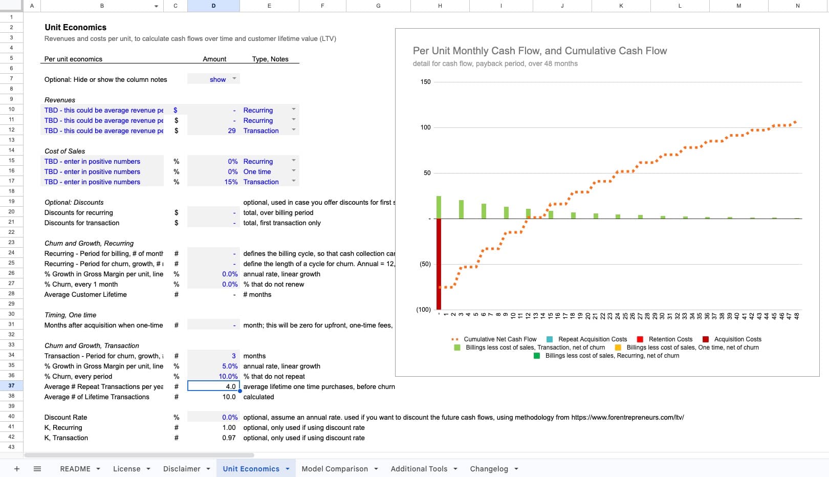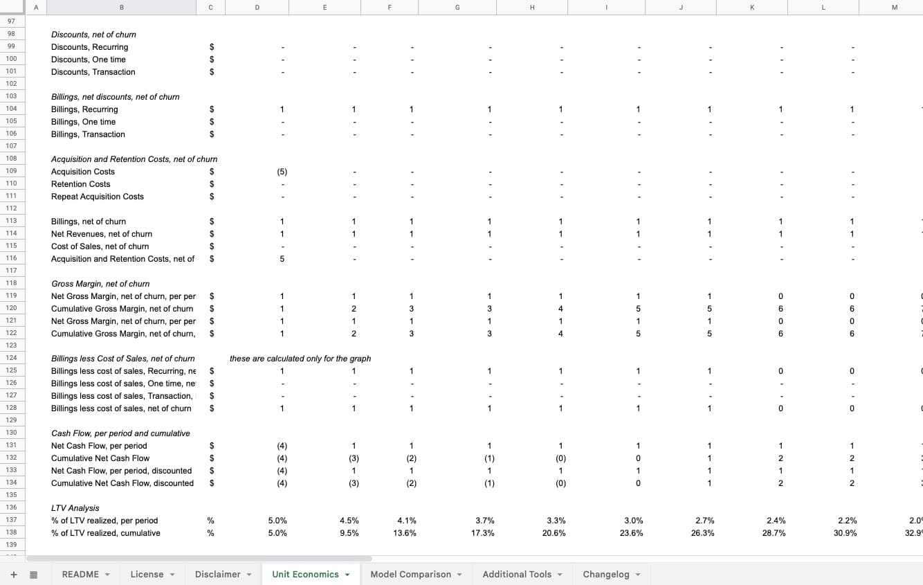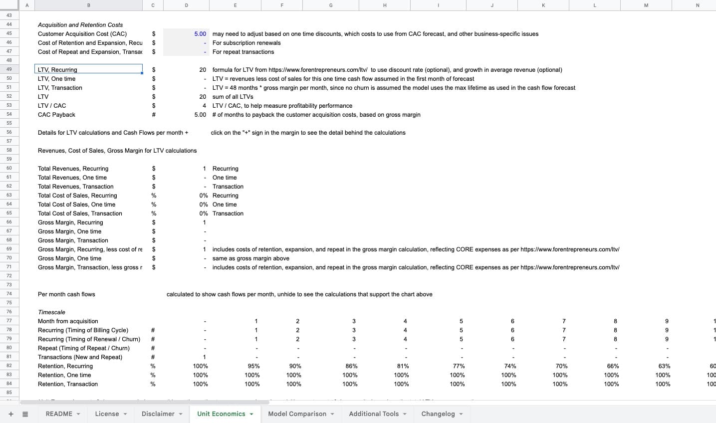 Focused tool for unit economics only. If you need expenses, hiring, financial statements, and cap table on top, use the Standard Financial Model. If you're modeling ecommerce specifically, try the Ecommerce Forecasting Tool for cohort-based new-vs-repeat customer logic.
