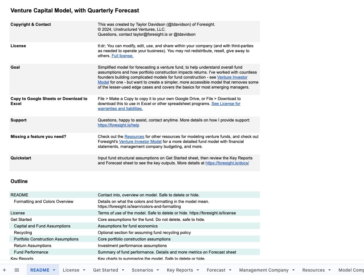 - Need the full annual model with fund-level financial statements, detailed waterfall, and LP classes? Use the Venture Capital Model.