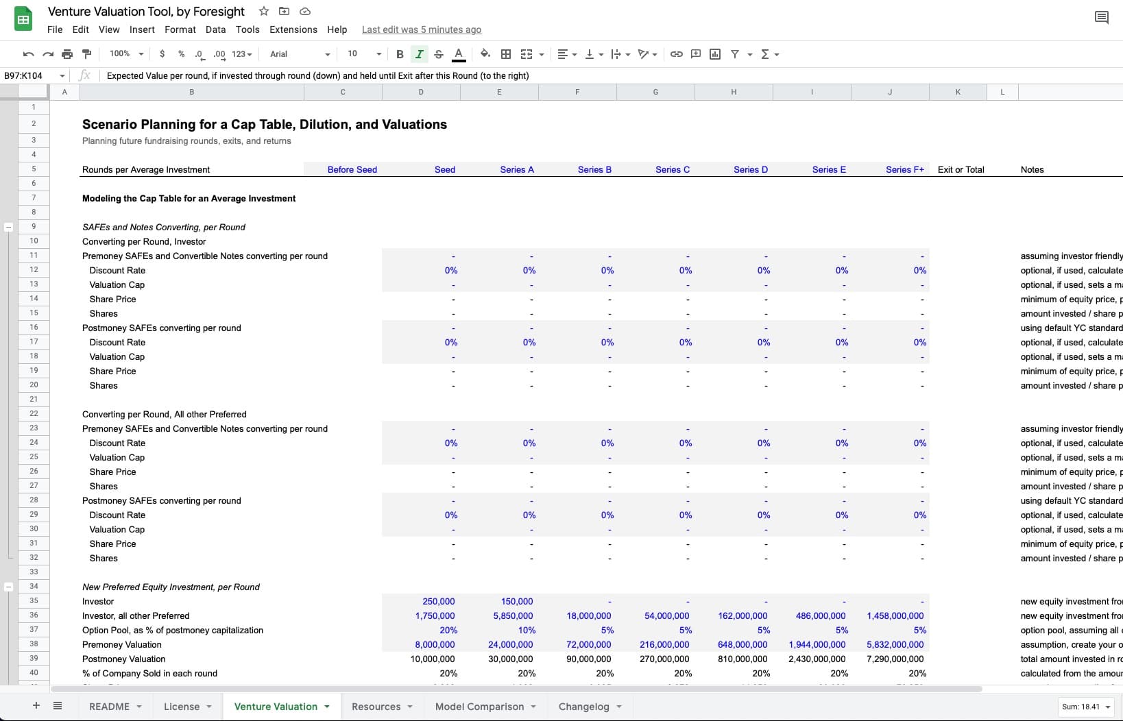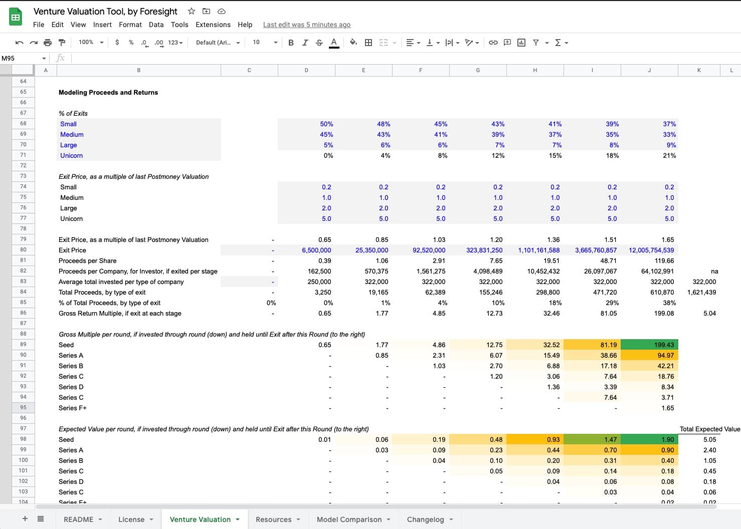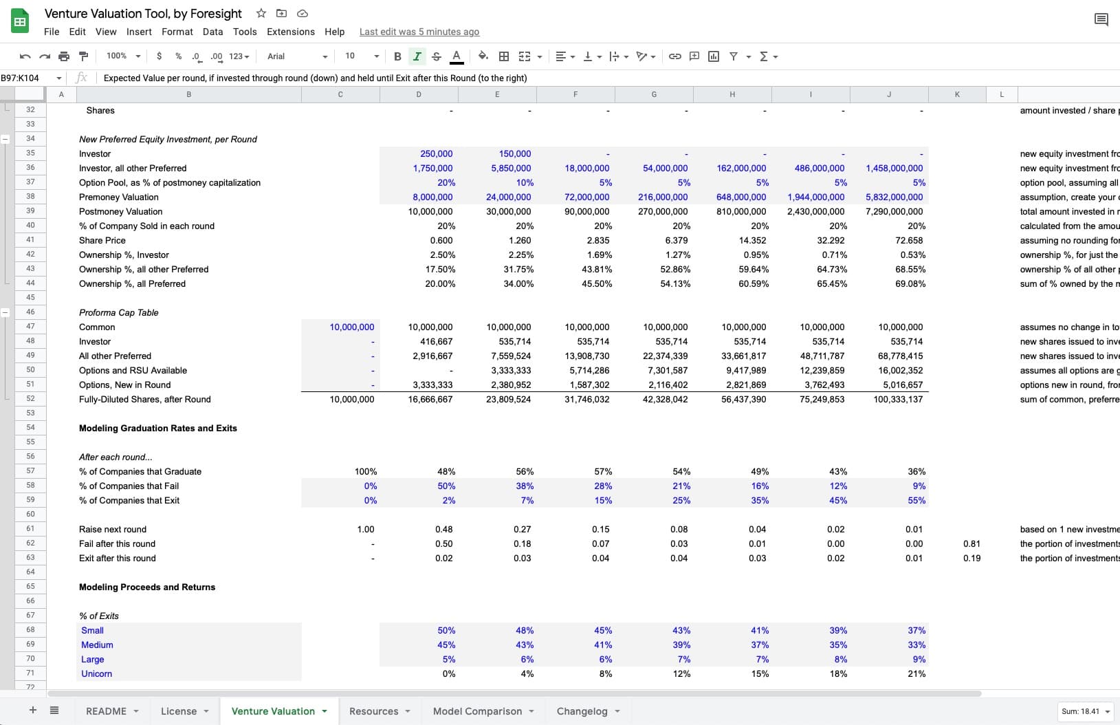 Analyze venture investment opportunities by modeling potential investment rounds (via equity, convertible notes, premoney and postmoney SAFEs), dilution, graduation rates, exit valuations, and likelihood of exit at multiple exit prices.